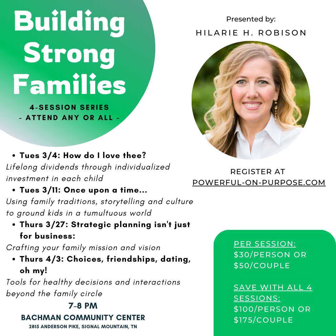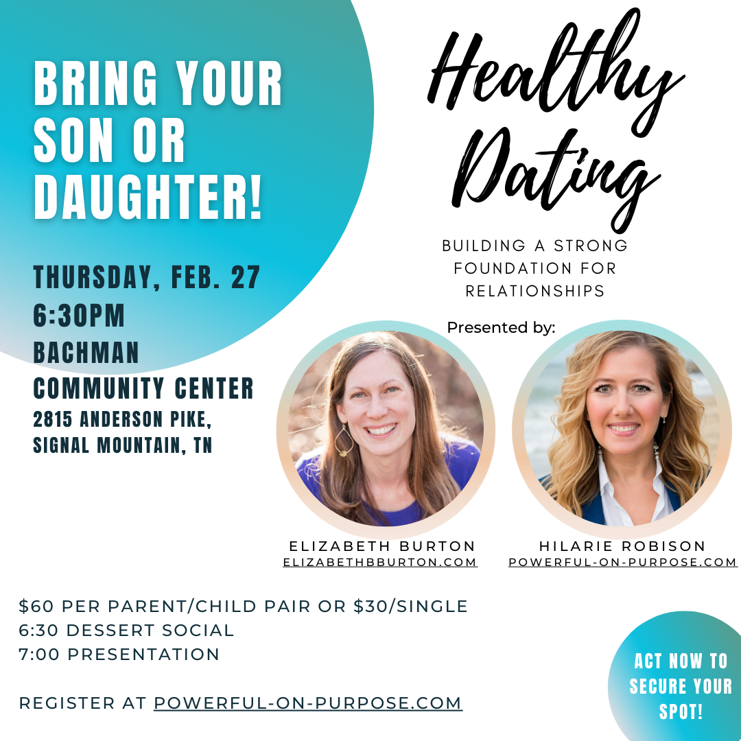 We are excited to again offer Healthy Dating due to your kind requests... and it is open to sons AND daughters... and moms or dads! Come as a parent-child pair for a meaningful night of shared learning and inspiration. Individuals are also welcome. We can't wait to be with you! REGISTER HERE